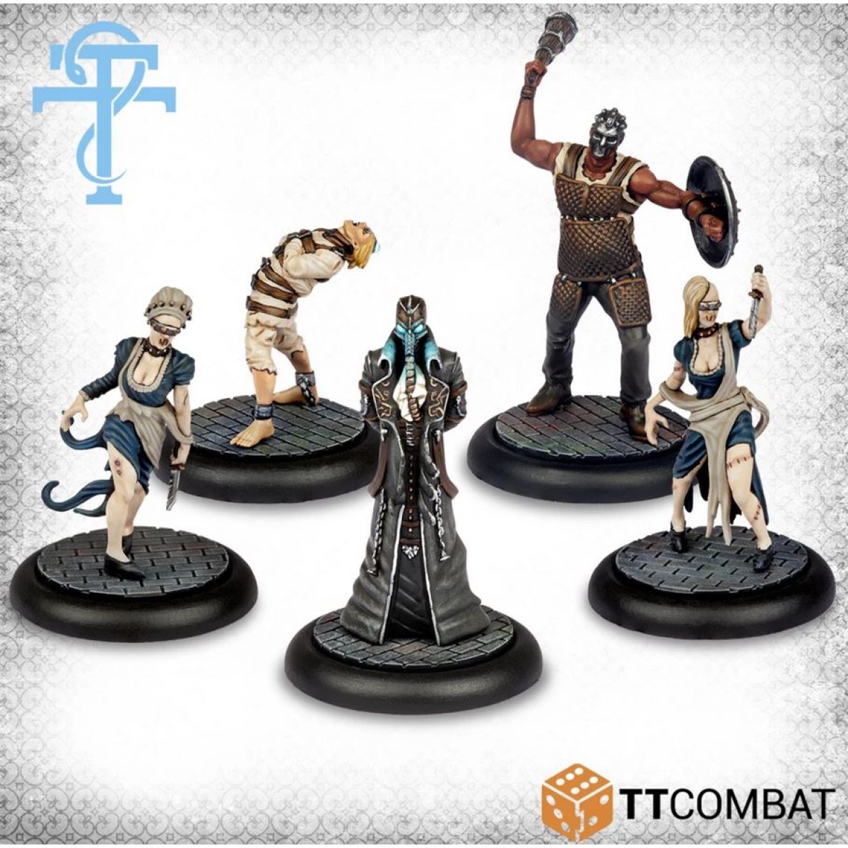 This box contains one of the most potent mages in Carnevale, and plenty of staff to help him achieve his goals. The Doctor of the Mind is a Leader unlike any others - frail, but terrifying to his enemies. What he lacks in strength is more than made up by the Warden, and he is accompanied by two Nurses to protect and heal him. And of course, what would a Doctor be without a Madman to accompany him to provide magic energy?