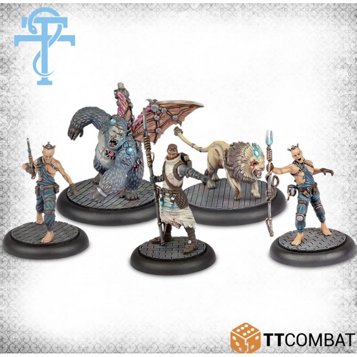 This box contains some real heavy hitters for a Doctors gang. The Doctor of the Beasts is a potent mage, and has complete control over the viciou Lion and the fiercly protective winged Gorilla. The force is backed up by two Lab Assistants, their shock prods working just as well on enemy fighters as on their own quarries.