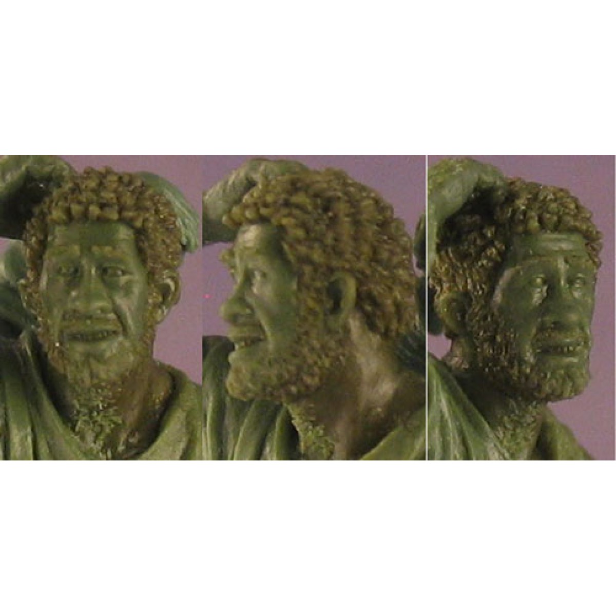 This Combo Pack includes all of the above miniatures, their standard individual bases and a bonus large diorama base (in pewter) that will allow you to place them in the positions above to create a little diorama of them.  Hodor has a great "clueless/off in his own world" look. Just kind of scratching his head and staring off in the distance at something unrelated to the conversation at hand between Bran and Meere/Jojen. He also has a very shaggy / unkempt look to reflect the fact that he is not really into grooming and would be given very functional haircuts / trimming and such.