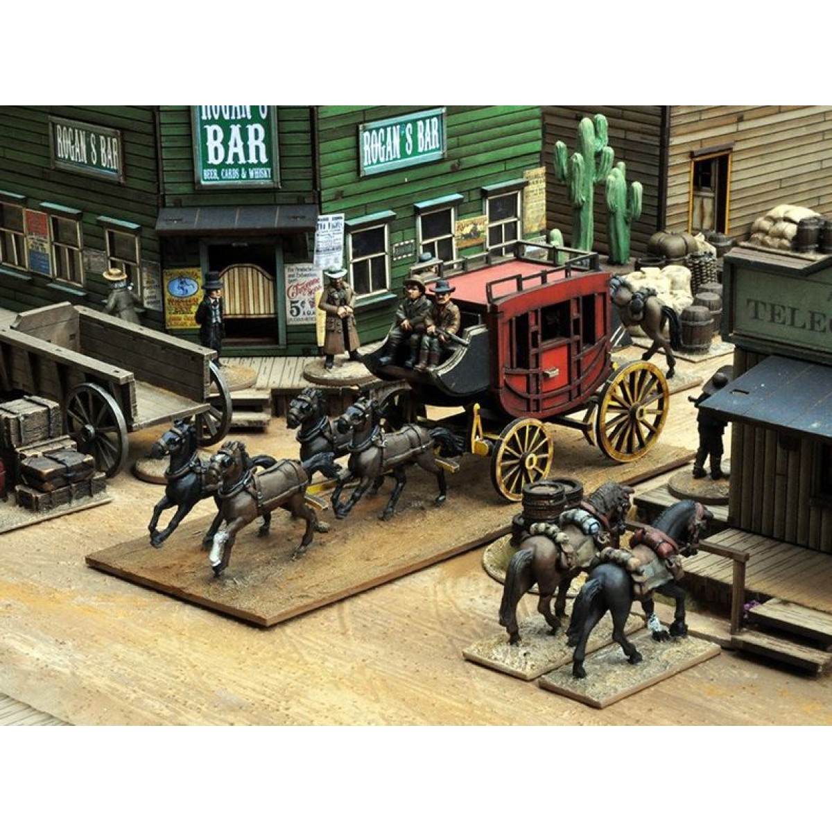 Contains four horses(Crusader Miniatures), driver and guard, two passengers, and a 4Ground stagecoach.