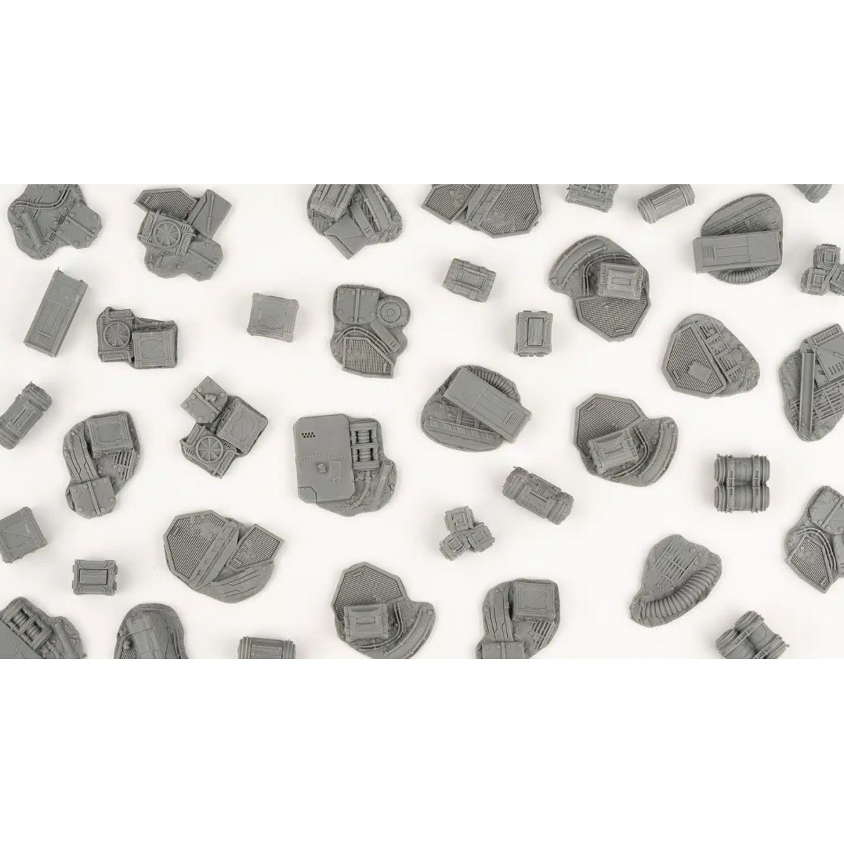 Perfect to simulate sci-fi containers, rusty metal floors, exposed wiring, and broken equipment scattered around. Each basing bit is carefully crafted to transport your miniatures to a sci-fi industrial world, challenging them to explore the partly buried corridors of an old derelict spacecraft.