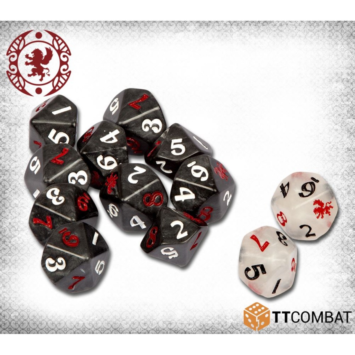 This pack contains 12 ten-sided dice; 10 in black, and 2 Destiny dice in white. Each number is delicately etched on, with the Carnevale lion taking the place of the 10. Not only that, but the 7, 8, 9 and lion are filled in a complementary colour, making spotting Aces easier than ever!