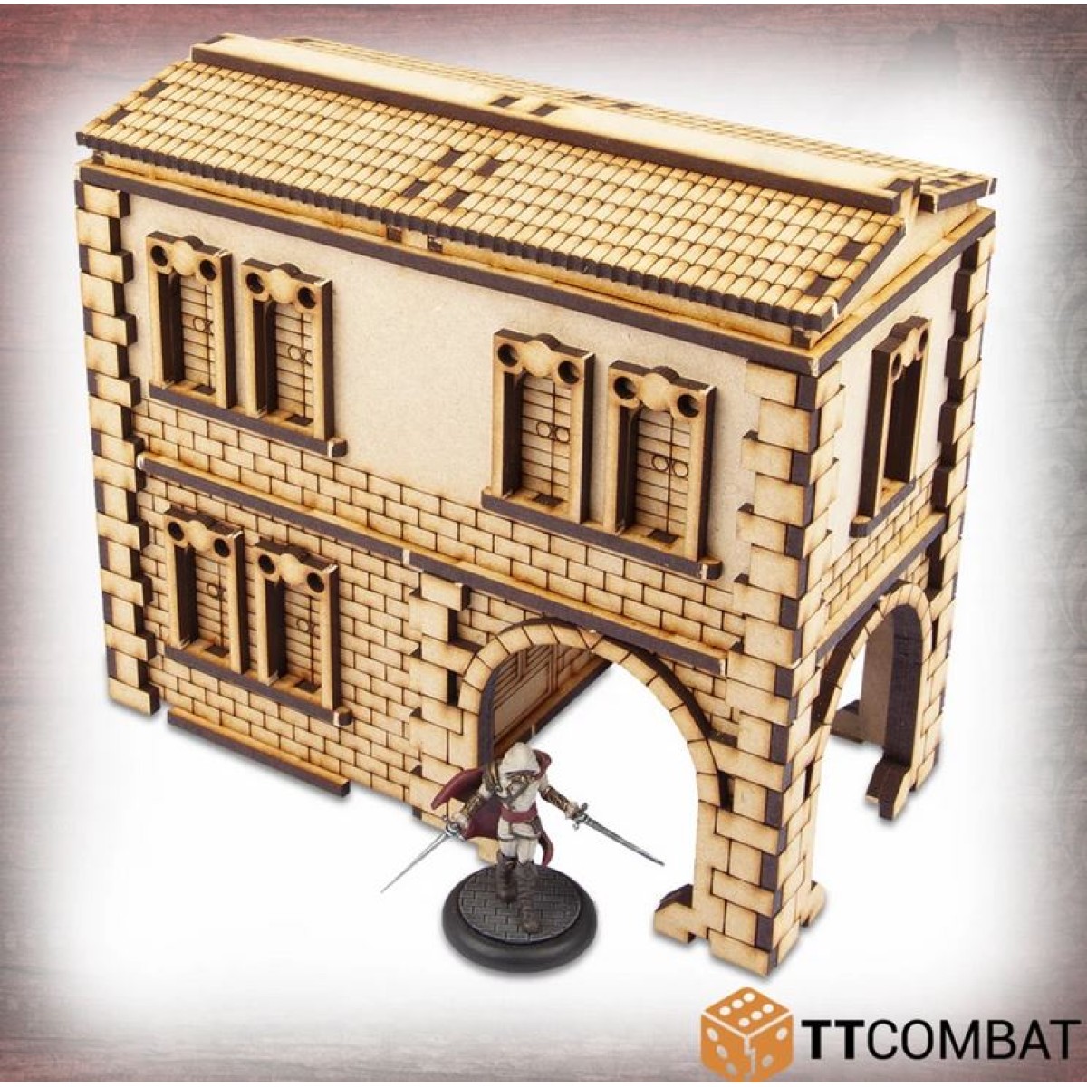 This kit is made from 3mm MDF and has been designed for Carnevale, using multiple storeys to climb and jump, and roofs at easy angles so that miniatures will not fall off when darting across the Venetian skyline. It is a great piece of scenery to use with other 28-32mm games.