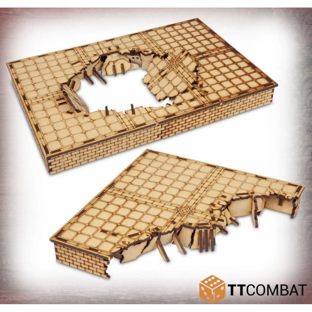 This kit contains 1 large and 1 plaza Ruined Street sections. The Plaza section can be opened up into two pieces, allowing you to fill out your board really easily and quickly. The damaged sections come with loads of detailed underneath, as bits of wood and brick have crumbled away and makeshift barriers have been put up to stop the water eroding them even more.