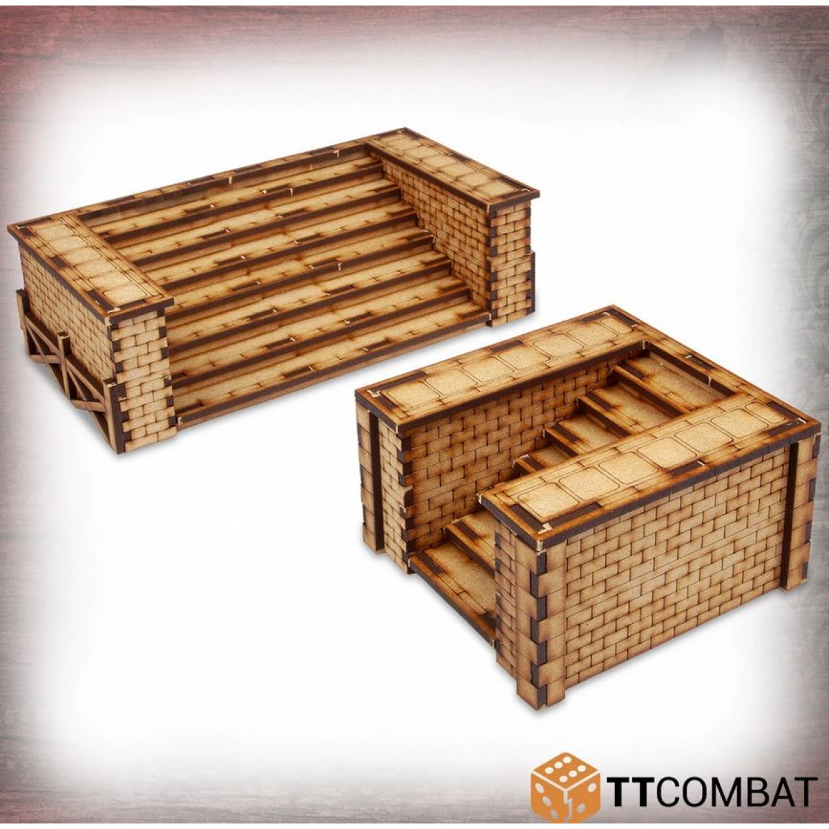 This kit contains 1 small raised stairs piece and 1 medium raised stairs piece. They make climbing into and out of canals even easier, and the steps are designed to sit a 30mm base comfortably. The set also contains a few optional ladders for your gang to climb out of the canals.