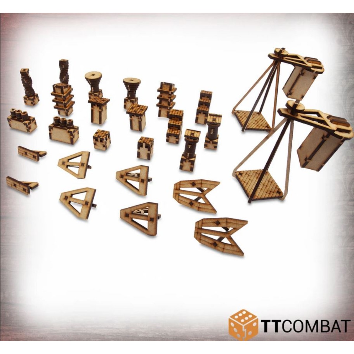 This kit is made from 3mm MDF and has been designed for Carnevale, with each accessory acting as a handy platform for climbing or a small obstacle for activating your chained jumps, even at rooftop level! It's also a great kit to use with other 28-32mm games, decorating any older style building in interesting and realistic ways.