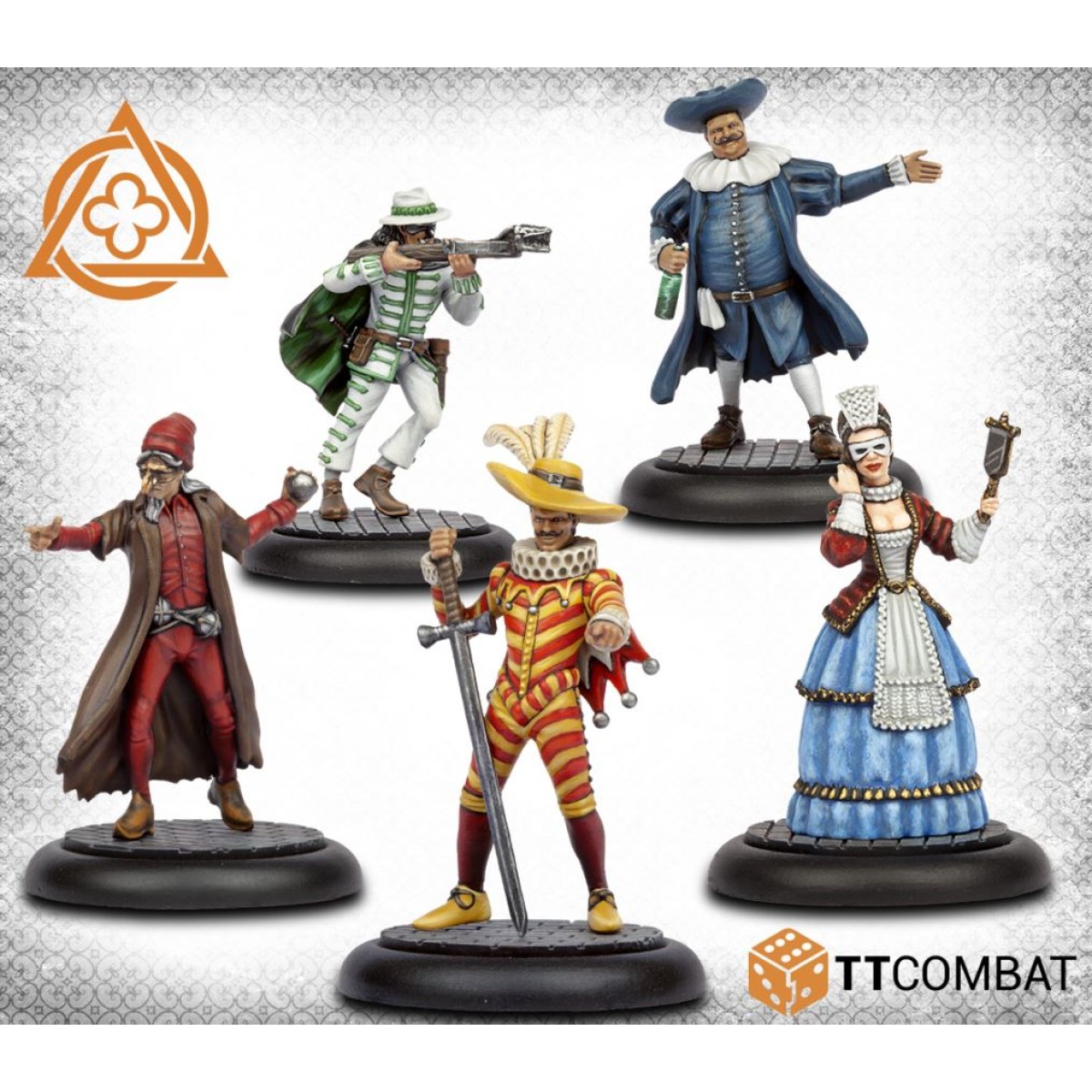 This box contains a complete Gifted gang. Gifted can be played as a mercenary faction, including any number in any other gang to provide a little extra punch. Alternatively, the fearless Il Capitano, overbearing Il Dottore, narcissistic Colombina, vengeful Brighella, and murderous Pantaleone can also be taken as a complete gang in their own right.
