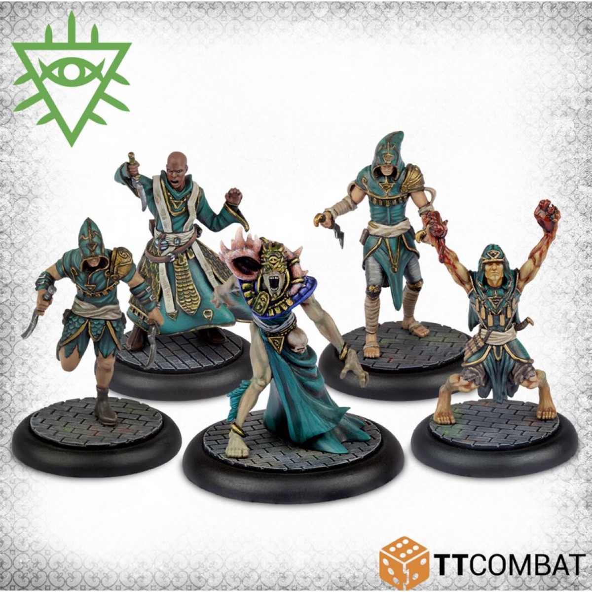 This box contains a complete gang for the Church of Dagon, or an expansion to an existing Rashaar force. The Voice of Dagon is a powerful supporting leader, able to make anyone do what it wants. The Dagonite Priest can summon various magic spells to aid, and the three Dagon Officiants provide the Rashaar with skilled ground-based fighters.