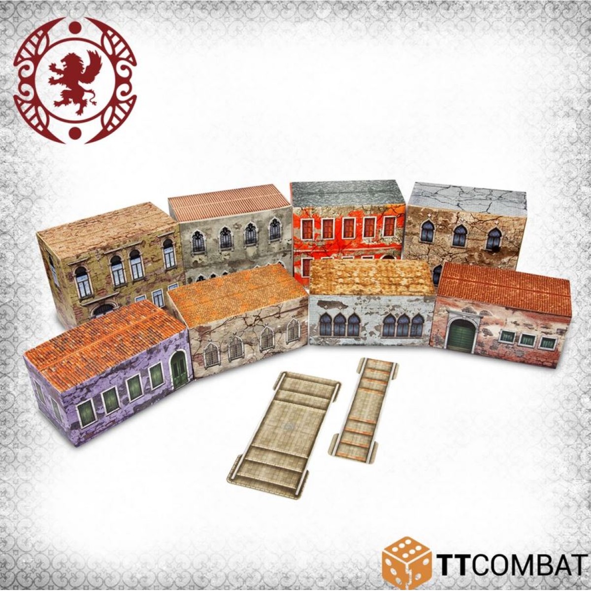 Venice is a bustling city, packed with buildings. Tight streets and narrow alleys provide the perfect backdrop for gangs to slip through the night without detection, the tall buildings masking their advances.Sneaking through the quiet streets and across the bubbling canals is only part of the skirmishes in Venice though. A street fight in La Serenissima is won or lost through careful positioning of fighters. Staying on the ground will find you prey to all manner of horrors down dark alleys or worse - from the depths of the water.Scaling a building gives a distinct advantage, able to see the entire district. There’s nothing more exhilirating than leaping across the rooftops. And there’s nothing more deadly than chasing your opponents over the skyline of Venice before striking from above.This pack contains 8 exquisitely detailed card buildings. With cracks across the surface and exposed brickwork, they sit perfectly in a district of Venice on the board. They go together simply and easily, allowing you to be tabletop ready within minutes. With flat roofs and a sturdy design, these buildings are a must for climbing and jumping across during your games.