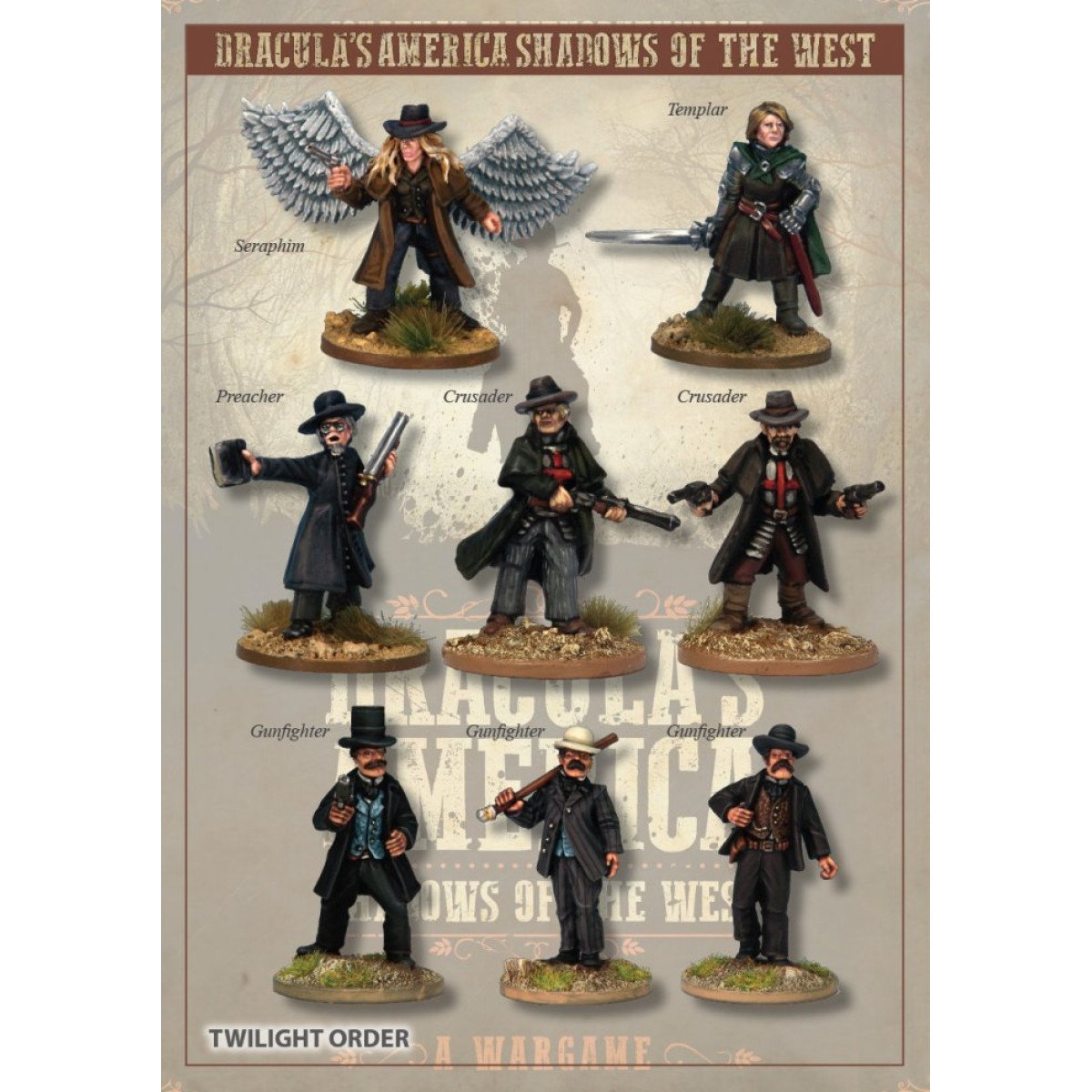All miniatures are 28mm sized. The miniatures are also all available in Dracula's America packs and Artizan Design Wild West packs.