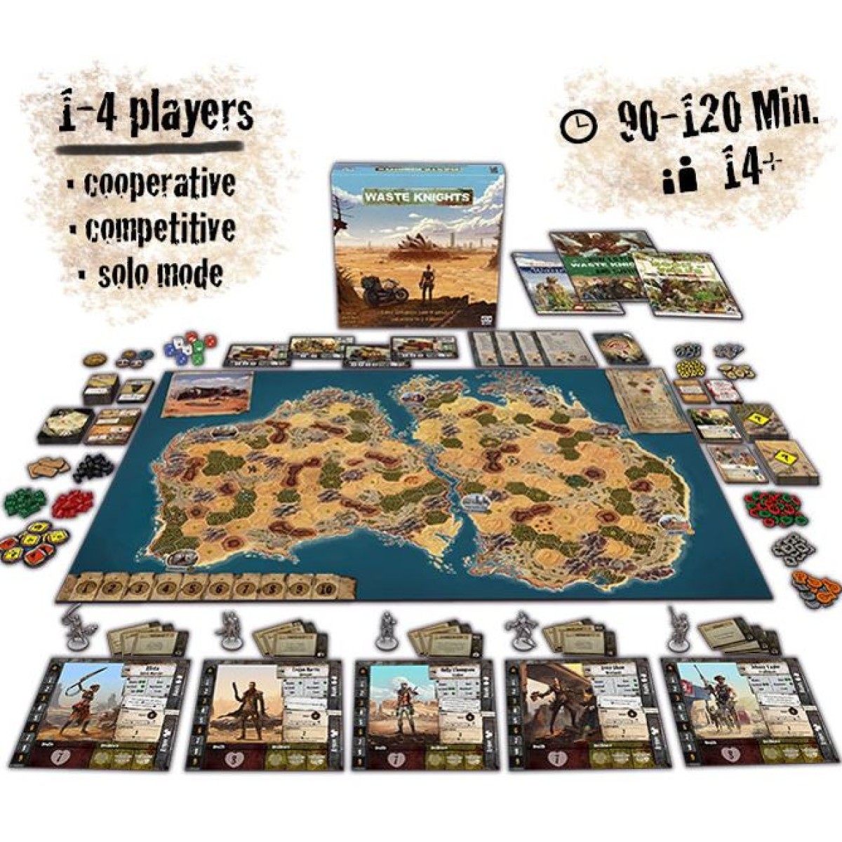 Waste Knights: Second Edition is a post-apocalyptic game of adventure and survival for 1-4 players inspired by cult classics of the post-apo cinema  and set in dystopian Australia destroyed by experiments of a powerful corporation. Each player becomes a rugged hero of the land, travelling through the wasteland, facing unnatural weather and enemies forged in long-forgotten laboratories as well as experiencing adventures full of dramatic choices and disturbing characters.
