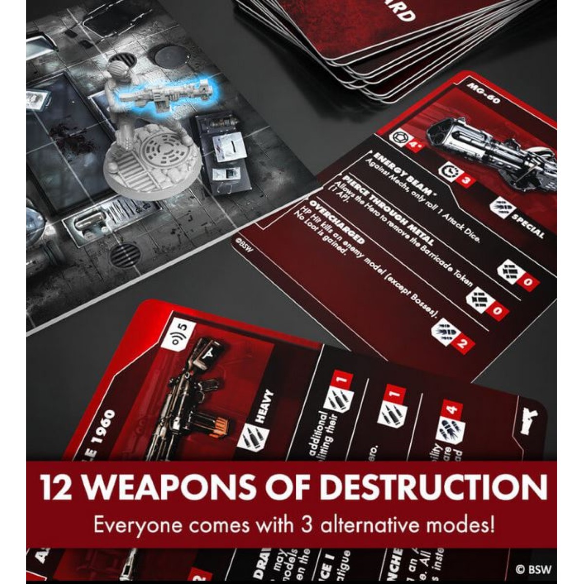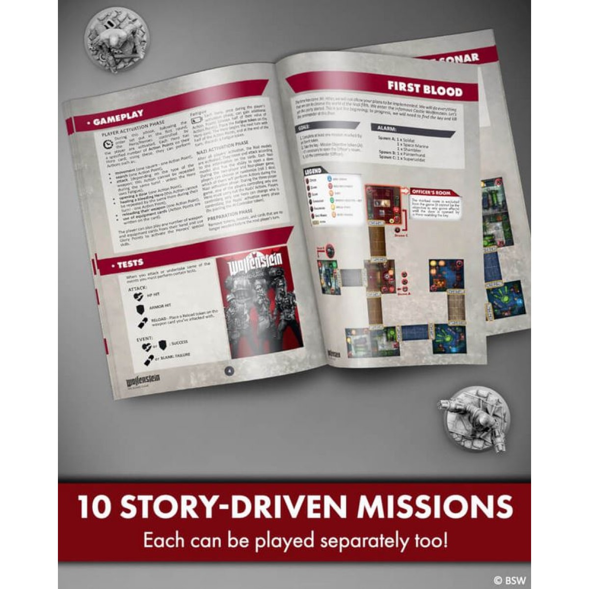 Controlled by players, BJ and his companions — in the form of 32 mm plastic figurines — must fight through the hordes of Nazis, explore Castle Wolfenstein, and perform dangerous missions, all to defeat the sinister plans of Adolf Hitler and his two cruel subordinates. Additional known characters will be available in future add-ons and expansions.