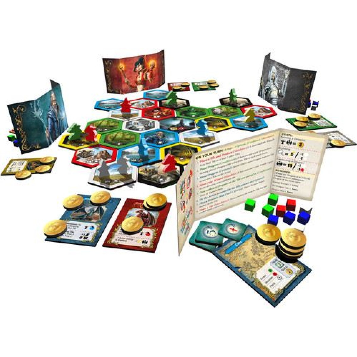 In Dragon Island, you and up to three other players take on the role of wizards cast away onto a seemingly deserted island. Players compete throughout their journey to gain as much treasure as possible, building up the island tile by double-sided tile. Discover exotic terrains, build special structures, manage your magical energy, and tame dragons!