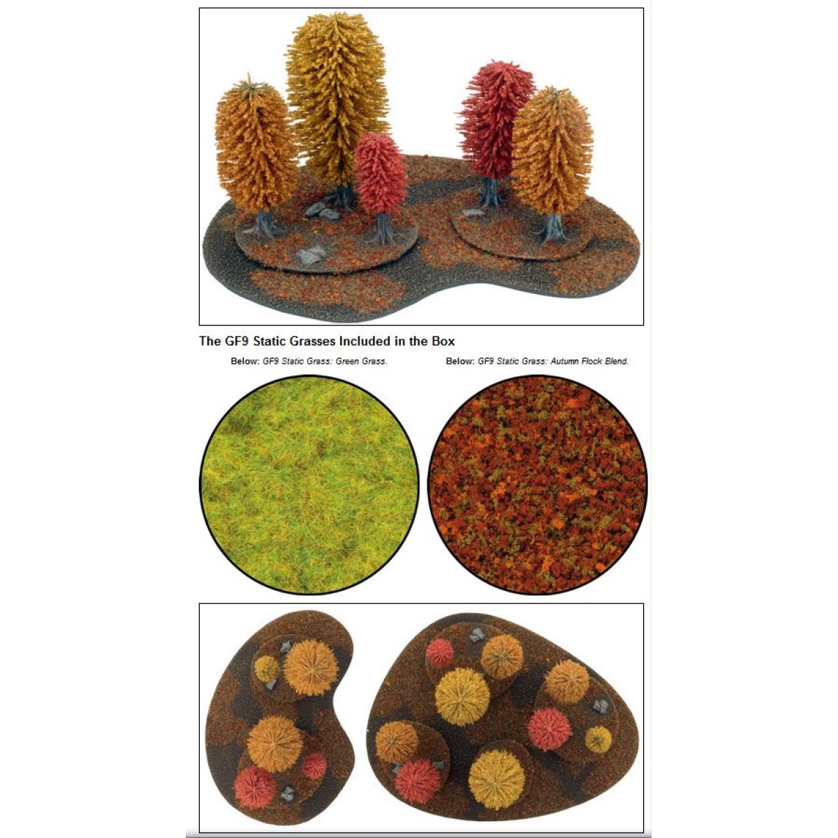 ■ 3x Triple Tree Stands ■ 2x Double Tree Stands ■ 1x Single Tree Stands ■ 4x Large Trees ■ 6x Medium Trees ■ 4x Small Trees ■ 2x Painted Forest Bases ■ 2x Packets of GF9 Static Grass.