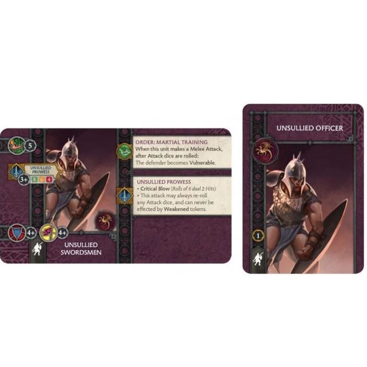 The Unsullied Swordsmen unit box for the A Song of Ice and Fire: Tabletop Miniatures Game gives Targaryen players an effective melee unit on the field. Their melee attacks hit at the weak points in enemy armour, granting numerous bonuses when they strike. The Officer Unit Attachment adds to their strengths, trading wounds with the enemy when being attacked, making this unit able to dish out wounds both when attacking and on the defensive.