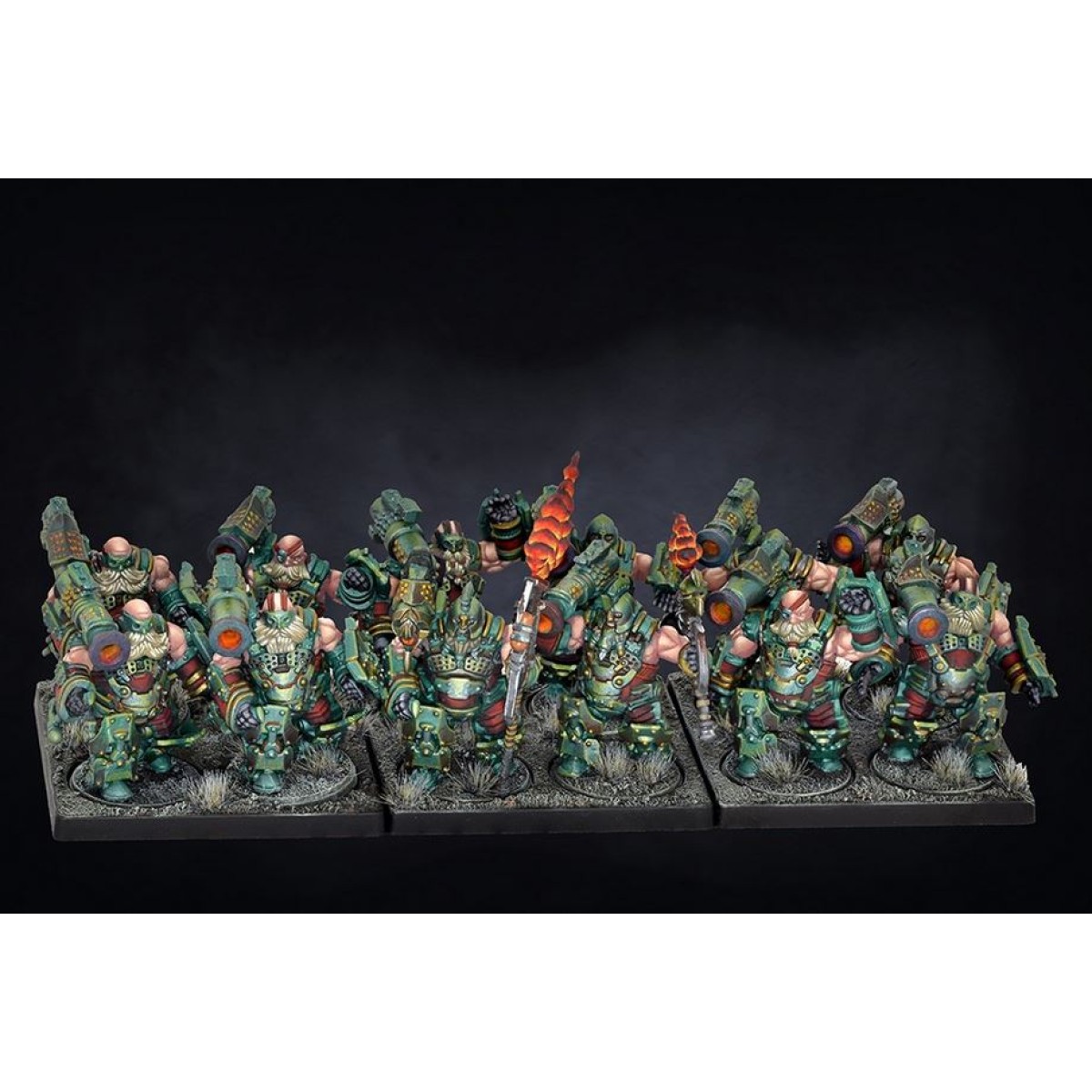 Unlike their Stoneforged brethren, the exoskeleton of the Fireforged is focused simply on the delivery and containment of their main armament: the Blast Cannon. Based on a scaled down design of the Hellbringer Cannons used to hunt the greatest of dragons, the Blast Cannons draw and shape the uncontrolled gift of their Dweghom users to generate powerful directional blasts of superheated flame capable of puncturing even the heaviest of plate at a hundred paces. Their powered exoskeletons enhance their strength, allowing the Fireforged to remain mobile on the field of battle despite the weight of the Blast Cannon to deliver their powerful blasts where most needed. More than capable in close combat, the Fireforged can then follow up a devastating salvo with a savage charge, or easily fend off light units and skirmishers, allowing their heavy weaponry to be employed at bringing down the most heavily armored of foes.
