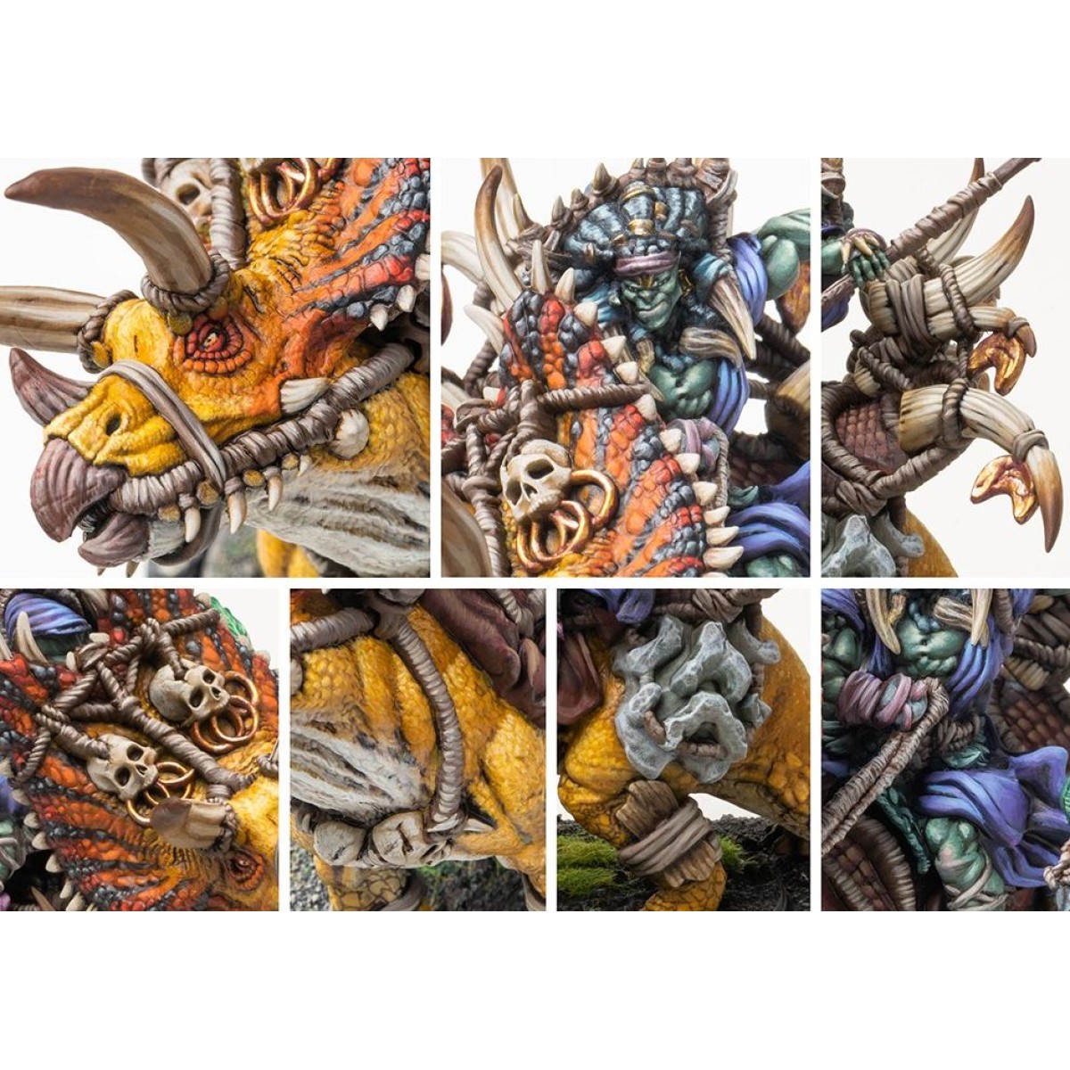 This figure was sculpted and designed by the team at Para-Bellum in keeping with our aesthetic, and created as a larger resin model befitting of our Artisan Series. This is a true artisan series miniature, with incredible details that make it a presence on a game table, or as a painted model. As the W’adrhŭn hosts thunders into battle, it is not uncommon for its leaders to lead from the vanguard. While it has been established that male W’adrhŭn struggle to form stable bonds with carnivorous dinosaurs, this poses no impediment to those who would seek to bond and ride a Ceratopsian dinosaur. Mounted atop this formidable beast, the Thunder Chieftain becomes a bastion of prowess and rallying point upon the battlefield, the ungainly and brutal nature of his mount’s attacks is more than offset by the sheer combat prowess displayed by the greatest warrior in the tribe.