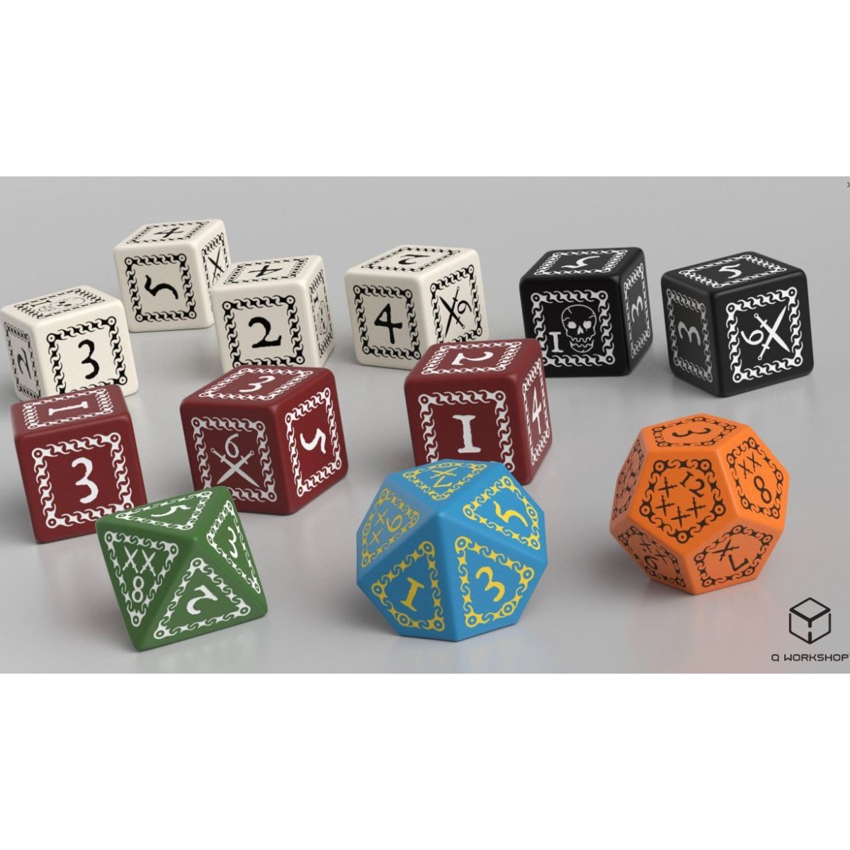 A set of 12 engraved custom dice, designed specifically for the Forbidden Lands roleplaying game. The set includes: