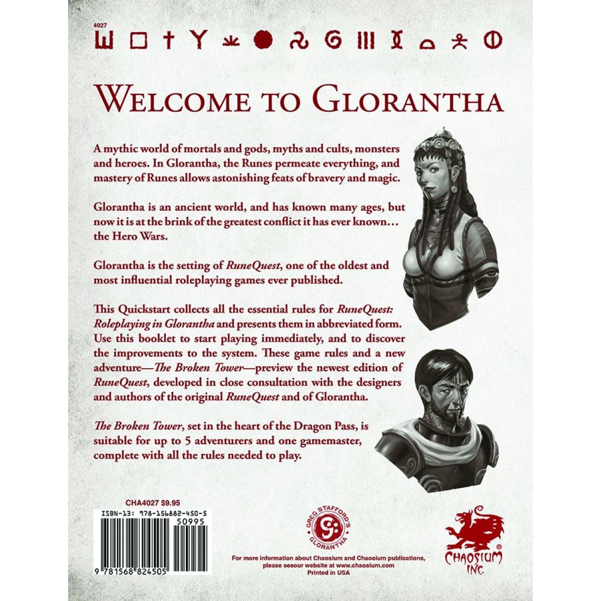 These game rules and a new adventure—The Broken Tower—preview the new edition of RuneQuest, developed in close consultation with the original designers and creators of RuneQuest and of Glorantha.