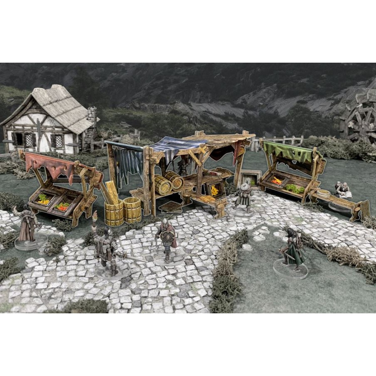 This pack upgrades your gaming table with a bustling marketplace. It includes a large marquee, two stalls, and a variety of barrels, crates and useful scatter terrain to add immersion to your board. The pieces are compatible with the rest of the Battle Systems Fantasy range.
