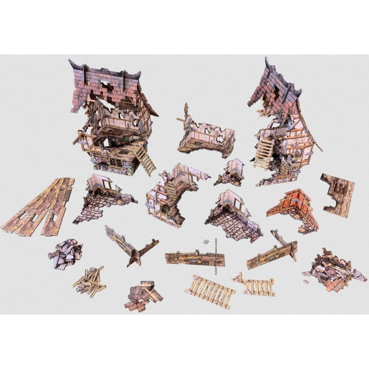 This box contains everything you need to turn your gaming table into a devastated town, suitable for many 28-35mm fantasy and historical games. The set can be used on its own to create a heavily ruined settlement, or the modular pieces can be combined with the other Fantasy Village buildings to partially ruin a whole town! The set includes walkways, ladders and other scatter terrain to accessorise your table.